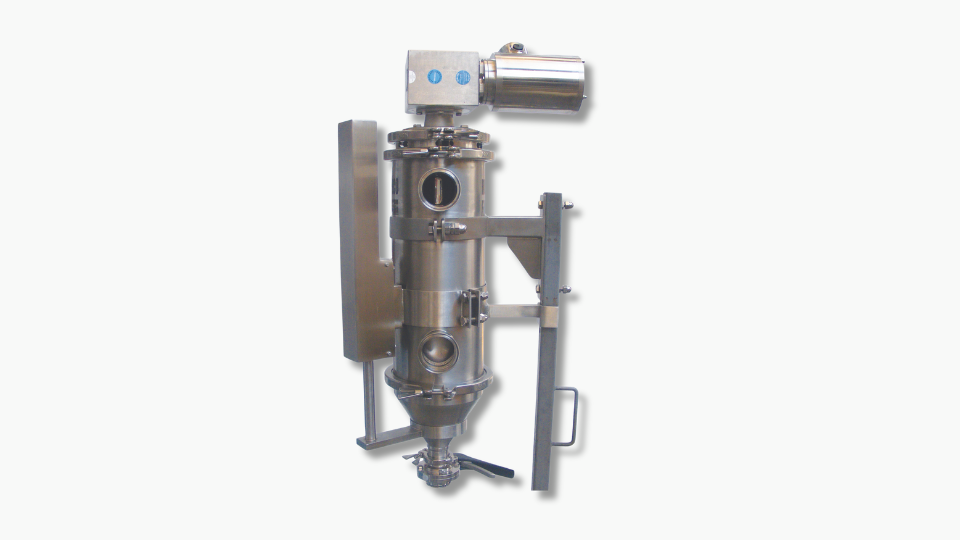 Dort gelangt sie in einen zylindrischen Filterkorb, wo ein Rotor die Flüssigkeit mithilfe der Zentrifugalkraft durch das Filtergewebe befördert.